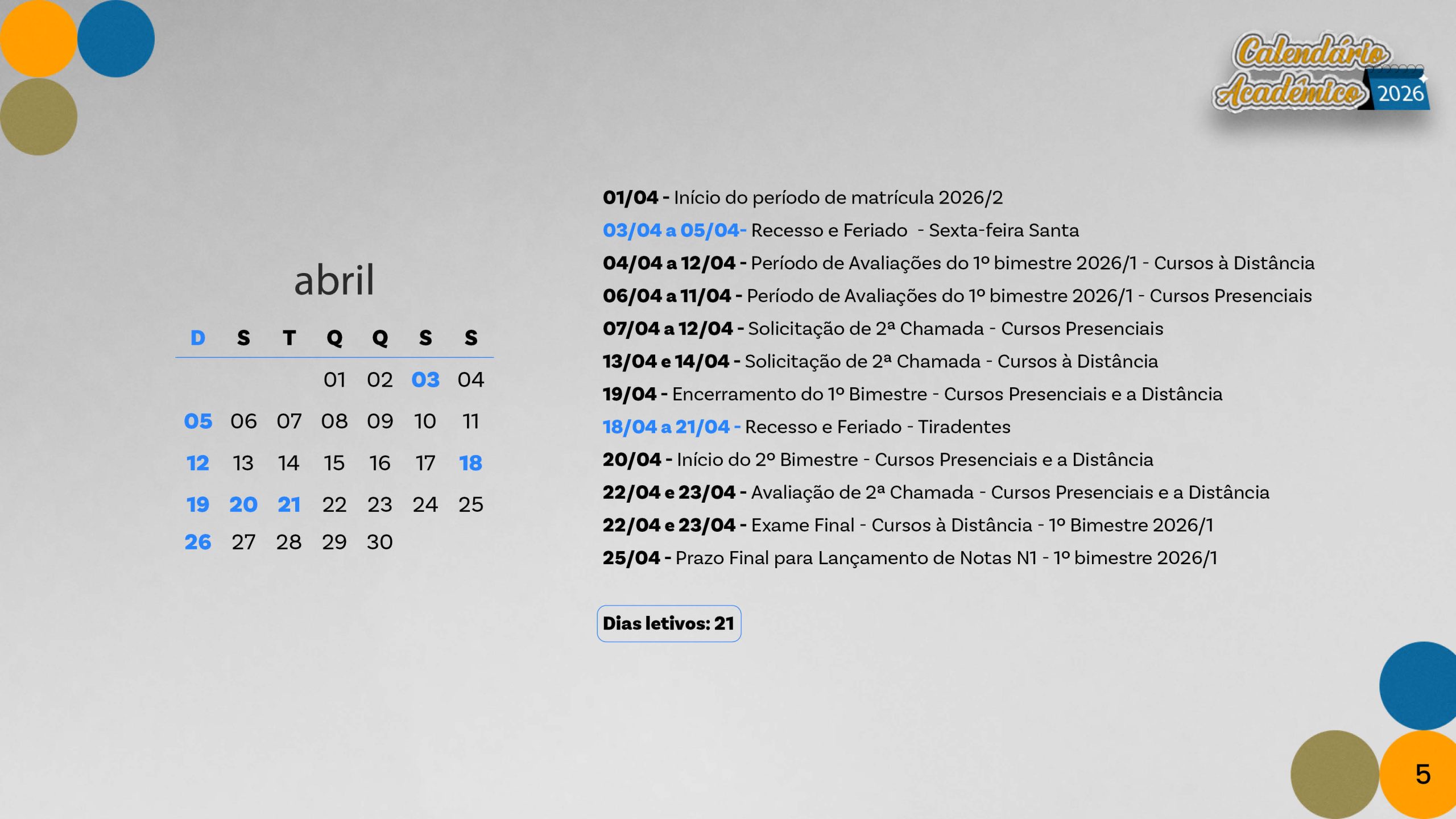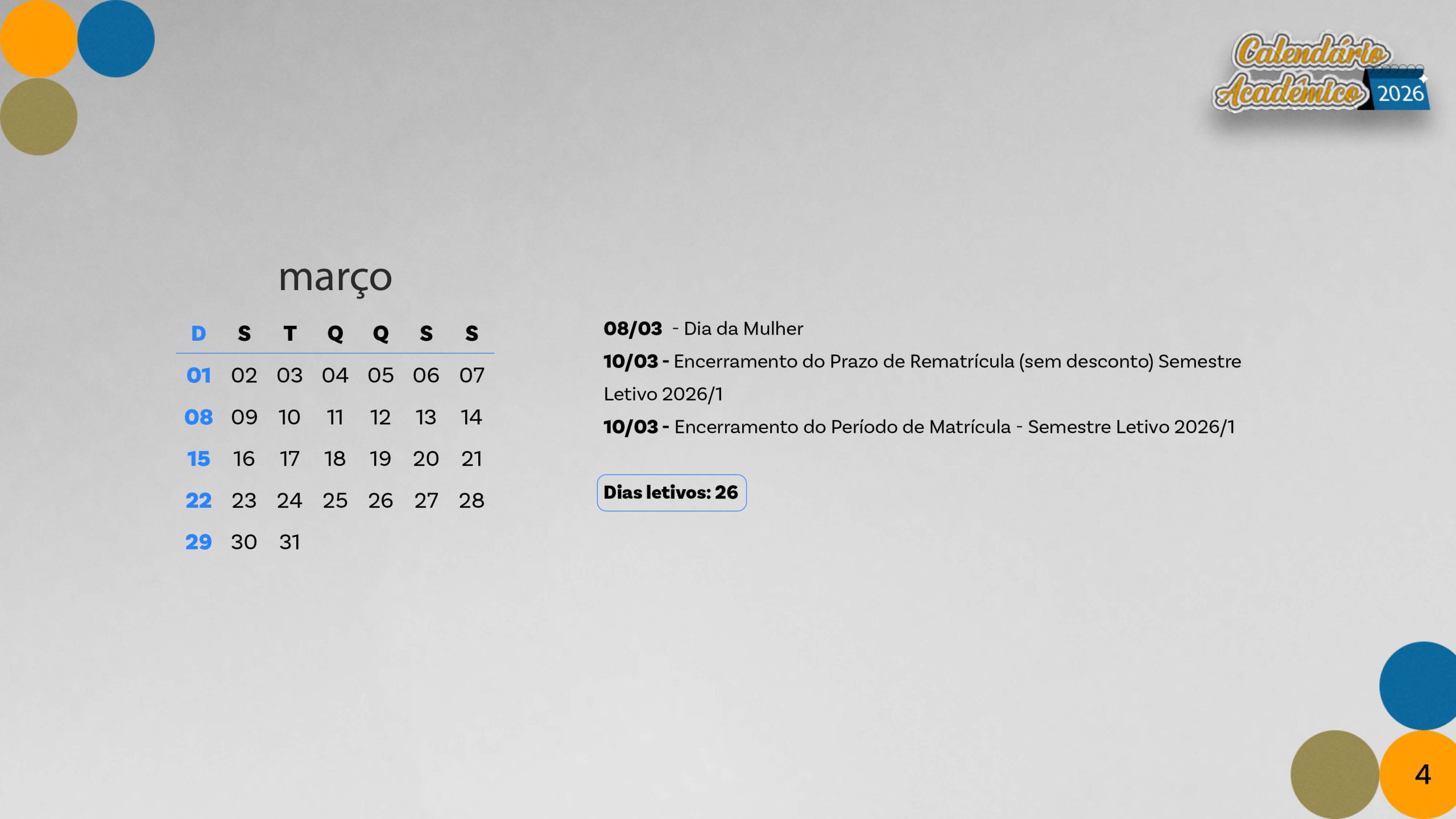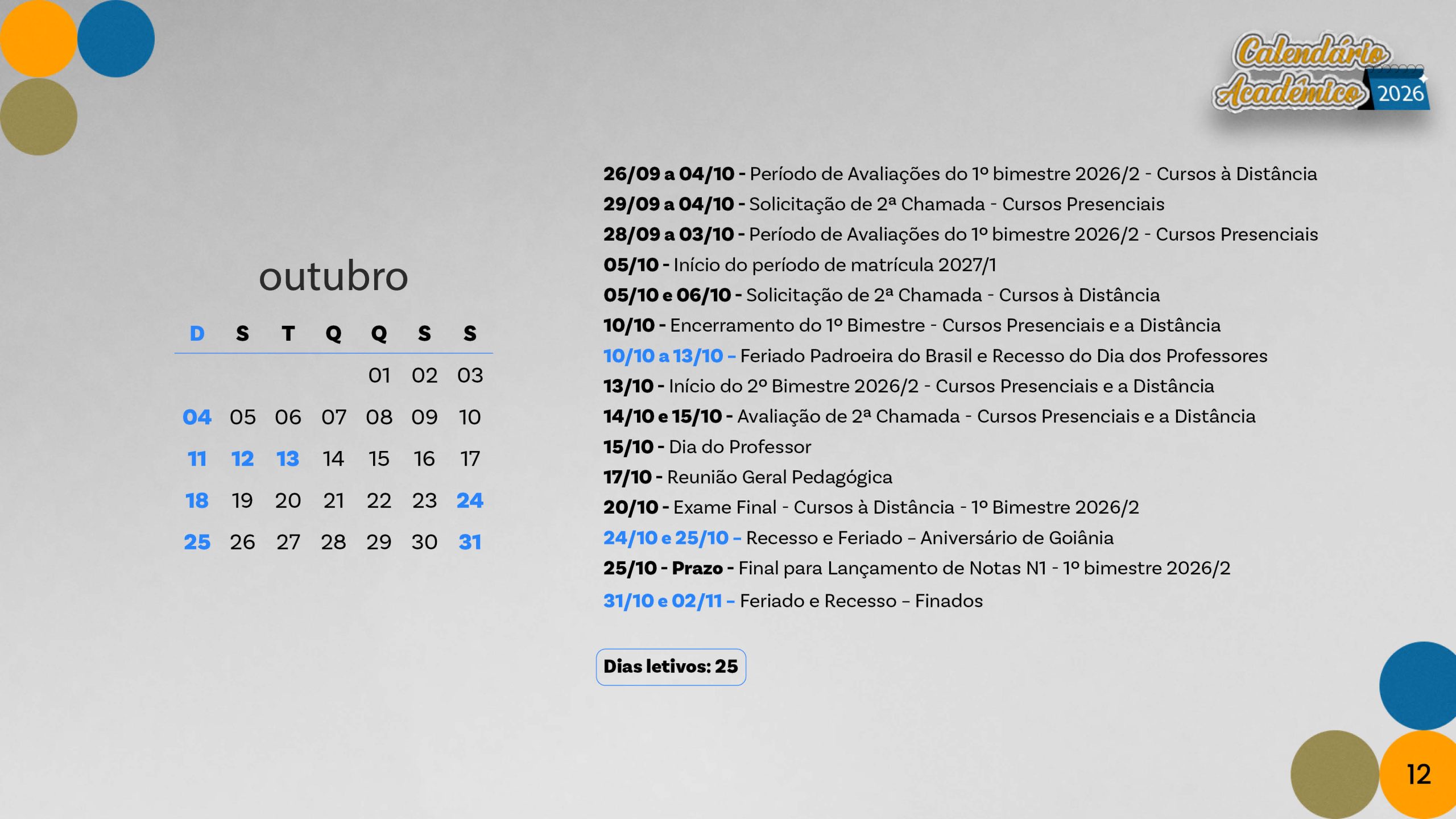Calendário acadêmico do ano de 2026.